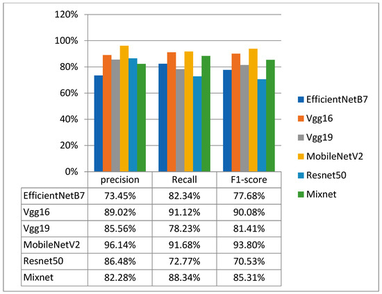 Figure 8 shows precision, recall and F1_score results for all models. The MobileNetV2 model performed best of all the pre-trained models tested. It achieved an accuracy of 93.08%, a loss of 21.31%, a precision of 96.14%, a recall of 91.68% and an F1_score of 93.80%. The effectiveness of the MobileNetV2 model, in particular, suggests its ability to extract relevant features from these complex medical images, enabling accurate classification.