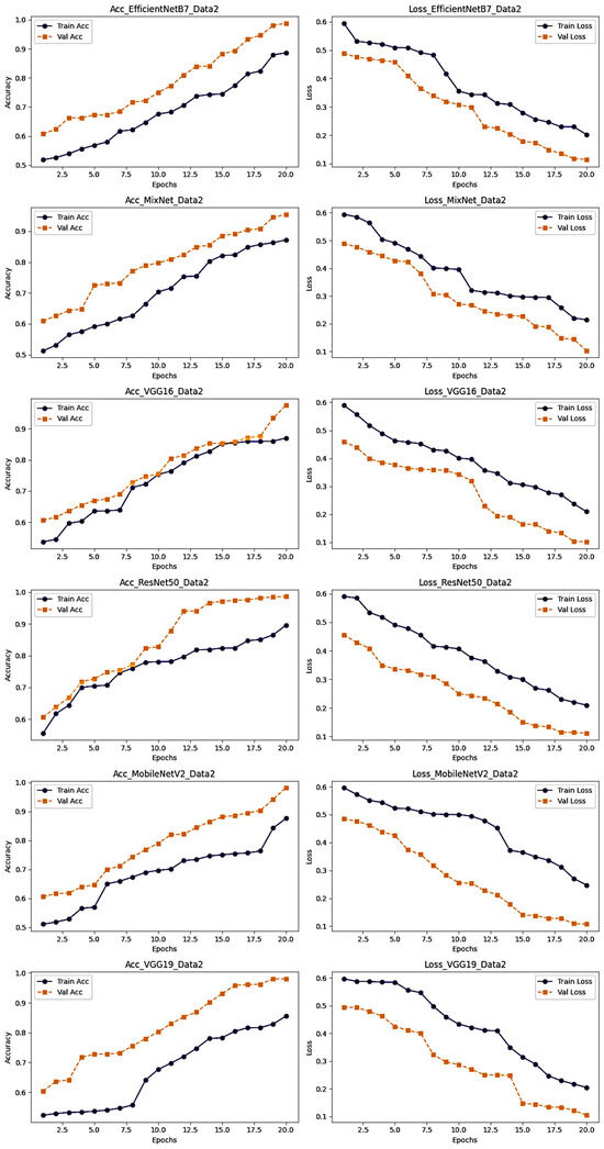 Accuracy and loss of each model on the second dataset.