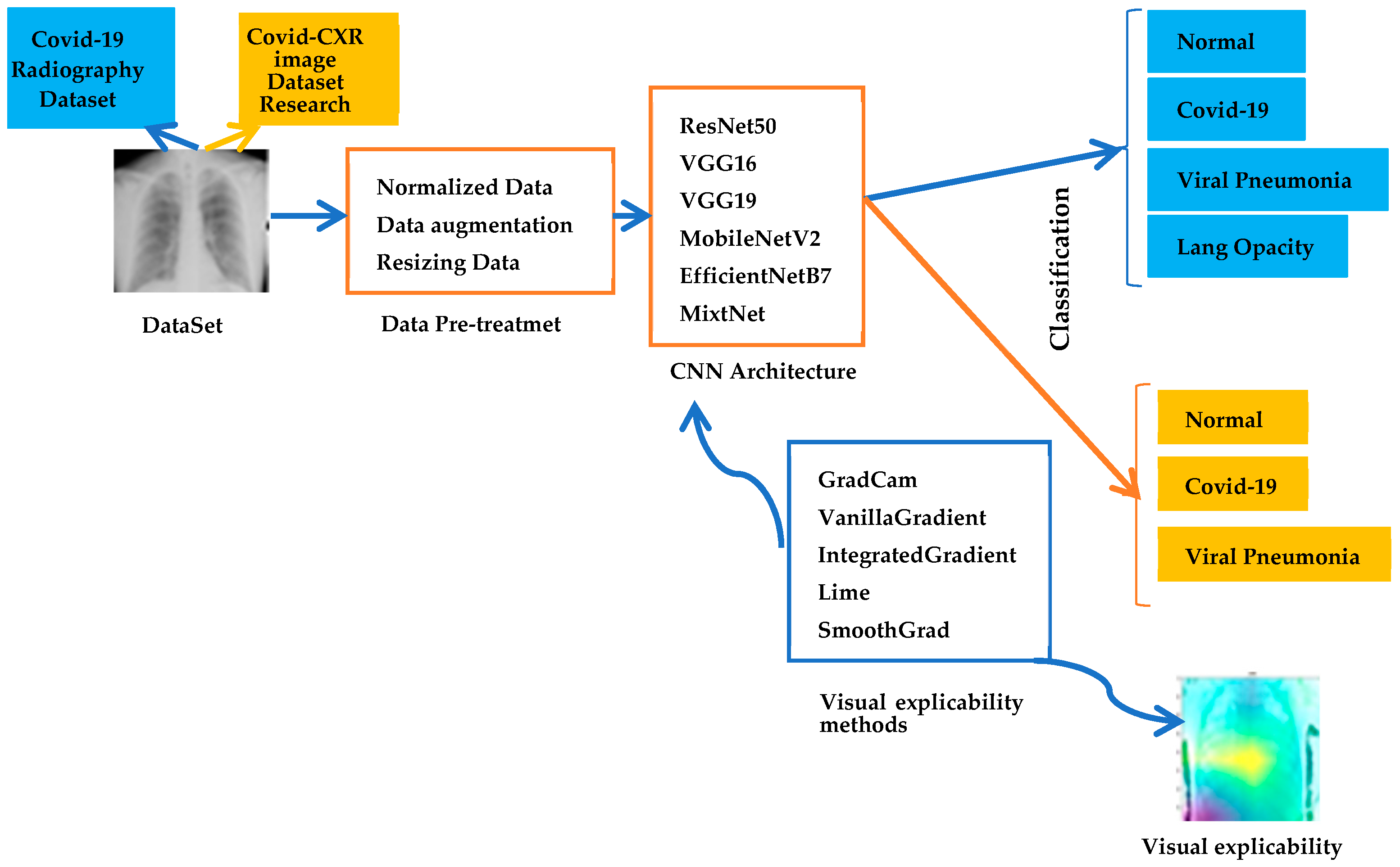 This section presents the various steps in the proposed model for explaining and classifying chest X-rays. It describes the proposed architecture based on two databases of chest X-rays, as well as the various data pre-processing steps applied. In addition, the use of transfer learning using pre-trained models such as VGG16 and ResNet50 is performed to improve the performance of the proposed model. The use of visual explainability methods in post-processing (Post-hoc) is then described.