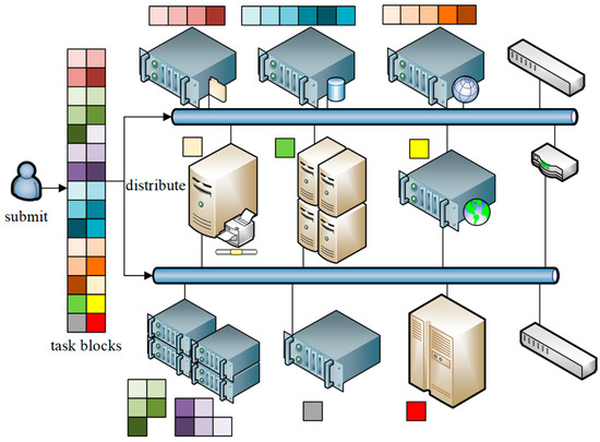 Load-balancing on a heterogeneous cluster platform. Squares of varying colors symbolize distinct categories of data.