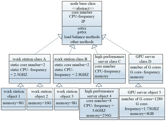 For instance, a “Workstation” class can be defined to represent a group of workstations with identical configurations. When we want to add a new node to a cluster, we simply instantiate an object of the appropriate computing node class. Beyond the set and get methods, additional methods can be defined within a computing node class to facilitate node management. All computing node classes inherit from a common base class, which is designated as an abstract type. This base class encapsulates the common attributes and methods shared by all computing node classes, effectively abstracting the most fundamental characteristics of a computing node. Figure 2 illustrates an example of a defined hierarchy for computing node classes.