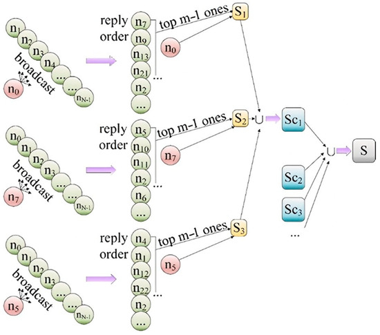 Figure 3 presents an example of node aggregation. The red node sends a broadcast to other nodes. According to the order of the reply, we can select the top m − 1 nodes and add the red node to form a set (indicated in yellow in the figure). We can take the union of the three yellow sets to obtain a sub-cluster. The union of all sub-clusters equals the original set S.