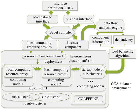 The original CCA parallel component application does not consider the processing capacity of the computing nodes on an execution platform. This results in an imbalance in the component tasks on different nodes. Nodes with strong computing power and fewer component instances will complete their tasks earlier; therefore, they will be idle. Other nodes spend a long time completing tasks. This imbalance causes computing resources on the platform to be wasted, reducing the performance of applications and the throughput of the whole system. To solve this problem, we added a mechanism for computing node resource management, business component data flow analysis, and component instance load-balancing using the Babel compiler and CCAFFEINE framework. We integrated them into an efficient parallel component application management and running environment, called CCA-balance. The structure of the whole environment is shown in Figure 4.