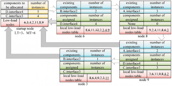 Figure 6 illustrates the execution process of the proposed load-balancing algorithm using an example. The startup node has five instances of component D and four instances of component C that must be allocated. It packages the names of these components, interfaces, input parameters of each instance, and its own low-load node table as a task allocation request and sends this request to the first node in its low-load node table, node 6. After receiving this request, node 6 first updates its local low-load node table, adds nodes 3, 4, and 9, and deletes node 12. According to its own load status (the number of existing component instances is 2 < LT), it assigns itself four instances of component D (MT−2 = 4) to generate and execute locally. It then deletes itself from the low-load node table in the task allocation request and local table. Next, node 6 modifies the task allocation request, deletes the component tasks it has just assigned itself, and then forwards the task allocation request to the first node in its local low-load node table, that is, node 8. Node 8 determines that it is not a low-load node. After updating the local low-load node table, it immediately sends the task allocation request to the first node in its low-load node table, that is, node 9. Node 9 updates its local low-load node table, deletes nodes 6 and 8, and adds nodes 4 and 2. According to its number of existing component instances (2 < LT), it assigns itself one component D and three instances of component C. It then deletes itself from the task allocation request and local low-load node table, deletes the component instance tasks it has just assigned itself from the task allocation request, and forwards the task allocation request to node 3. Node 3 updates its local low-load node table, deletes nodes 8, 6, and 9, and adds node 11. According to the number of its existing instances (1 < LT), it assigns itself one instance of component C from the task allocation request. Node 3 deletes itself from the local low-load node table. At this point, all the component instances in the task allocation requests sent from the startup node have been assigned. In Figure 6, the white arrow indicates the delivery of the task allocation request. The gray arrows indicate replies to the startup node.