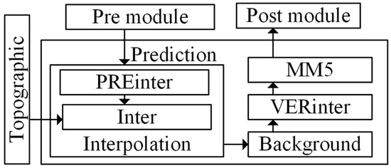 First, the input data are pre-processed. The Topographic module processes the terrain data to generate the terrain data file. The PREinter module reads the preprocessed data and generates the data required by the Inter module, which interpolates the input data. The Background module analyzes the background field data at the barometric layer. The VERinter module reads the background field data and generates the initial grid data and boundary conditions. The MM5 module produces its forecast using the data obtained from other modules. Finally, the Post module generates visual graphics based on the forecast results.