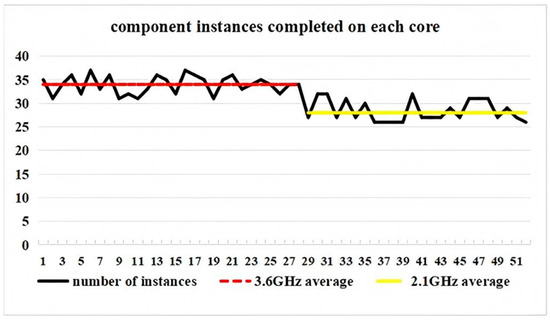 A comparison of Figure 8 and Figure 9 reveals that there is a small gap in the number of component instances executed in the different CPU cores that is due to the difference in the size of the component instances. However, from the perspective of effective working time, each CPU core completed nearly the same amount of work, demonstrating the effect of our load-balancing mechanism.