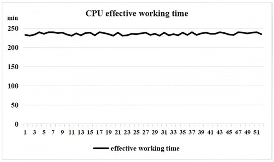 A CPU core with a strong processing capacity can quickly complete its existing tasks, thus returning to a low load status and becoming able to accept more new tasks. Meanwhile, our approximately even distribution does not imply that the numbers of component instances completed by the cores with the same frequency are identical. As Figure 8 reveals, CPU cores with the same frequency complete different numbers of instances. This is because the component instances vary in size. For CPU cores with the same frequency, over the same period, a core may be able to complete multiple small instances, whereas another core with large instances may only be able to complete one large instance. Figure 9 shows the statistics of the effective working time on each node. The effective working time refers to the total time spent running all component instances assigned to a CPU core.