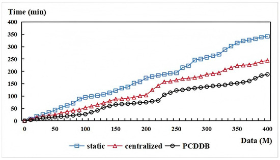 We first compared the performances of the three methods through experiments. The PCDDB version MM5 application was deployed on cluster Sc2. We set LT = 2 and MT = 10 as the initial threshold values of the corresponding threshold on a single-core node. The values on the dual-core nodes and the 8-core nodes were multiplied by the corresponding number of cores. The applications using the other two load-balancing methods were deployed on a cluster composed of fourteen randomly selected dual-core nodes and three 8-core nodes. The size of the input data was varied, and the execution times of the applications using the three different load-balancing methods were recorded. The input data range spans from 0 to 400 M, with measurements taken at regular intervals of 10 (i.e., 0, 10, 20, 30, …, 400), resulting in a total of 41 experimental trials for each method. The results are presented in Figure 10. The static load-balancing decision was made prior to application execution and thus cannot account for the load conditions of nodes during runtime. It assigns components to different nodes before execution based solely on the application’s component definitions and process requirements, which results in inferior performance compared to the other two methods. The dynamic, centralized load-balancing method, on the other hand, deployed component instance tasks to nodes with lighter loads during application execution, based on real-time load conditions of the computing nodes. This approach outperforms the static method. However, it is entirely dependent on a single central scheduler for generating and executing load scheduling decisions, which places a significant burden on the management node hosting the scheduler and incurs a relatively high load-balancing overhead. In contrast, the PCDDB method’s dynamic, distributed load-balancing decision-making captured the load conditions of computing nodes in real time and distributed the load-balancing overhead across various computing nodes within a sub-cluster that enjoyed good communication conditions. This approach has demonstrated the best performance compared to the other two methods.