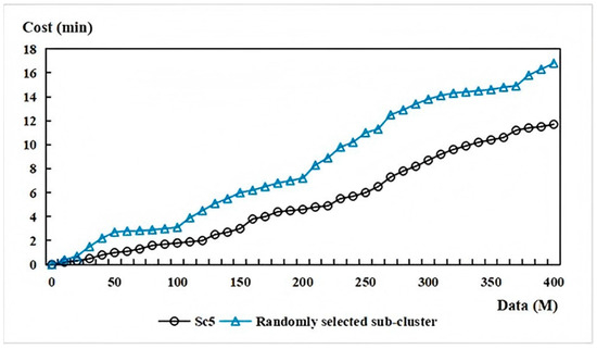 To further evaluate the advantages of the proposed node aggregation in reducing the communication overhead of the load-balancing mechanism, we deployed the MM5 component application on sub-cluster SC5. A cluster was composed of eighteen randomly selected dual-core nodes and three 10-core nodes. We set LT = 4, MT = 20 on the dual-core node and LT = 20, MT = 100 on the 10-core node. While changing the size of the input data, we recorded the communication costs of load-balancing. The communication cost includes the transmission of the low-load status from the computing node to the startup node in the load-balancing algorithm, transmission of the component instance task allocation requests between nodes, and replies sent by nodes accepting certain component instances to the startup node. Experiments were conducted across a range of 0 to 400 M in increments of 10 (0, 10, 20, …, 400), totaling 41 data points. Figure 11 shows the result of the communication cost test, revealing that when the proposed load-balancing mechanism was taken, deploying the application on a sub-cluster generated by our aggregation algorithm lowered the communication cost.