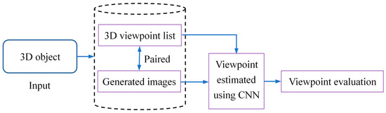 Although our goal is to develop an image-based viewpoint estimation method, this issue also involves obtaining an image dataset with accurate viewpoint information and establishing a reasonable evaluation metric. Therefore, the proposed method consists of four modules: obtaining viewpoints, generating an image dataset with viewpoint annotations, estimating a viewpoint using a CNN, and evaluating the accuracy of the estimated viewpoint. The flow chart of the proposed method is shown in Figure 2.