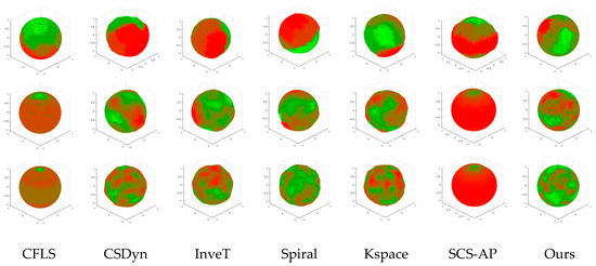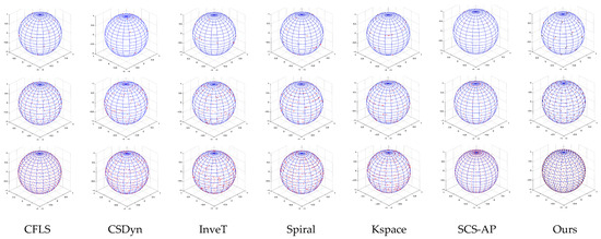 To verify the effectiveness of our method, we conducted comparative experiments. Several representative methods include the CFLS [33], Continuous Stochastic Dynamics (CSDyn) [34], Inverse Transform sampling (https://github.com/benroberts999/inverseTransformSample, access date: 10 March 2025) (InveT), analytically exact spiral scheme (Spiral) [35], sampling of concentric spherical shells in k-space with the new strategy (Kspace) [36], the traditional Spherical Coordinate Sampling using Azimuthal rotation and the Polar rotation (SCS-AP), and ours. The spherical sampling results of these methods are shown in the first row of Figure 3.