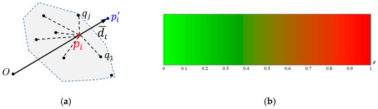 Schematic diagram of visualization scheme of the nearest neighbor average distance. (a) Moving direction; and (b) color scheme.