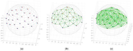 Thirty-one viewpoints in front of the object in the upper hemisphere are used to construct viewpoint-related projection images, and a neighbor topology link graph with three neighbor angles. The colors of lines and fonts are only used for differentiation and have no other meaning. The number next to the vertex is the sequence number of the sampling viewpoint. (a) The neighbor ship is built according to ; (b) The neighbor ship is built according to ; (c) The neighbor ship is built according to .