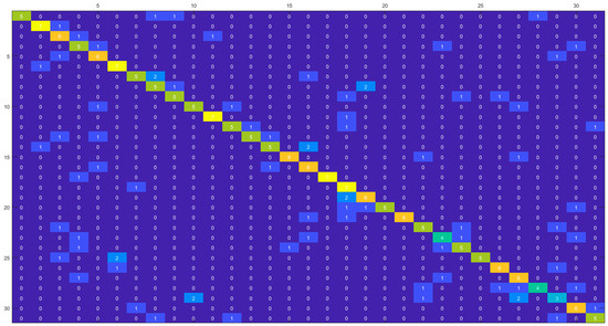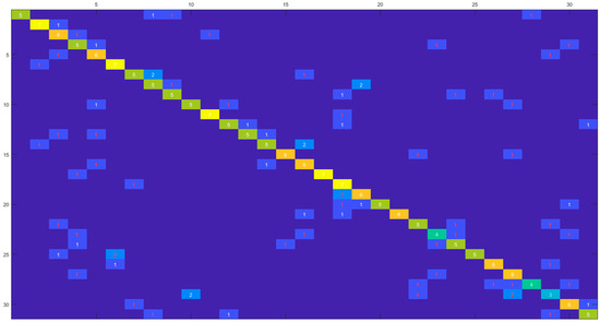 From the generated dataset, we randomly select images for training, where rounds number to the lower integer. Since each class consists of 29 images, there are 21 images in each class in the training set, and the remaining eight images are used for testing. The maximum number of iterations is set to 20,000, with other parameters set to their default values. The training process takes 10,719.46 s, and the training accuracy is 100% due to the small training set. The confusion matrix of the test set is shown as a heat map in Figure 11. By summing the diagonal elements and taking the total number of images, the classification accuracy can be calculated to be 0.6855, corresponding to .