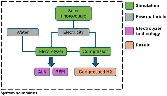 The importance of green hydrogen in combating climate change lies in its potential to replace fossil fuels in hard to decarbonize sectors [24]. However, the development of green hydrogen faces challenges, primarily related to production costs and the need for expanded infrastructure. As progress is made in decarbonization and the cost of renewable energy generation decreases, these obstacles are expected to be overcome, allowing green hydrogen to play a crucial role in the global energy transition [26,28]. In this context, the present article aims to promote the expansion and use of floating solar energy through the development of a mathematics-based technical model that enables the analysis of its integration with green hydrogen production stations [29], the assessment of energy efficiency gains resulting from increased solar irradiance in marine locations, as well as the impact of component efficiencies and key operating parameters in the green hydrogen production station (photovoltaic panels, electrolyzer, and compressor), on the total required surface area of photovoltaic panels. This reduction will not only simplify the support and anchoring structures of floating solar power stations but also reduce overall costs and improve structural stability under extreme wind and wave conditions. For these reasons, a mathematics-based technical model of a green hydrogen production station powered by solar energy is presented to be used as a generic framework applicable to any location worldwide. This station can be equipped with two types of electrolyzers (Figure 1): alkaline (ALK) and proton exchange membrane (PEM).