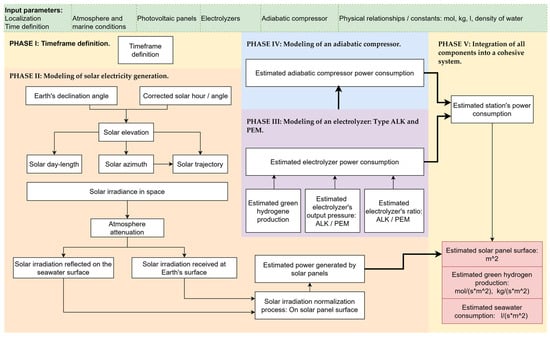 The development of the mathematics-based technical model and its subsequent validation through the execution of a set of numerical simulations requires a logical and structured approach, consisting of distinct phases that simplify the original problem while preserving the sequential and/or parallel relationships among their components. Figure 2 presents the high-level flow diagram used for the development and simulation of the proposed technical model for a green hydrogen production station powered by solar energy.