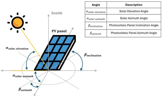 As shown, in PHASE I, the simulation time frame was defined by setting the total duration and time intervals for the calculations. In PHASE II, the solar-based electricity generation process is modeled. This involves first determining the position of the sun relative to the photovoltaic panels and subsequently calculating the solar radiation received on their surface. To model the sun’s position relative to the photovoltaic panels, it is necessary to determine the following variables: Earth’s declination (), corrected solar angle (), solar elevation angle (), solar azimuth angle (), photovoltaic panel inclination angle (), and photovoltaic panel inclination angle () (Figure 3).