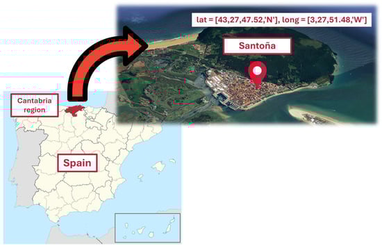 The first step is to model the set of trigonometric relationships used as the basis for calculating the absolute position of the sun relative to the final selected location of the station [30,31]. These relationships allow for the calculation of the Earth’s declination angle (), solar hour angle (), solar elevation angle (), solar azimuth angle (), and the day length ().
