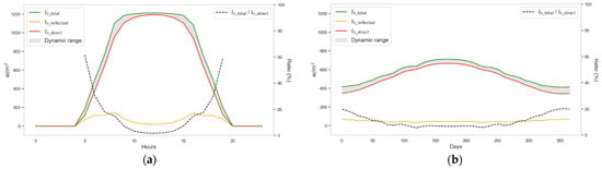 In this way, the value of the reflected and perpendicular solar radiation received on the panels’ surface () is modeled using the following expression: