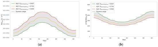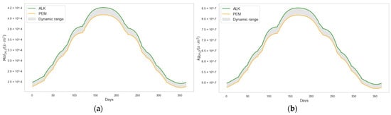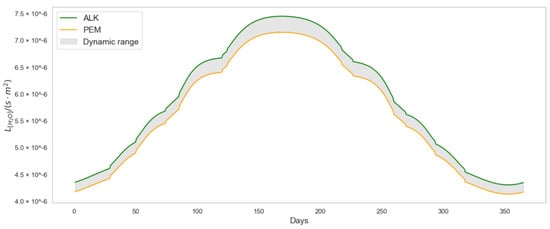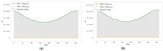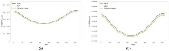 According to recently published ALK and PEM electrolyzer models [42], the authors estimate the value of (Equations (30) and (31)) based on the commissioning year of the station, respectively.