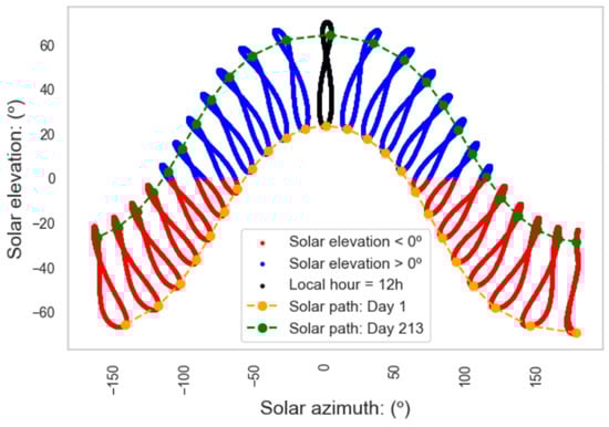 The solar elevation angle () is the angle formed by the solar rays with the horizon line as seen from the location of the green hydrogen station. This angle is modeled using a trigonometric relationship that depends on lat (Equation (1)), (Equations (2) and (3)), and (Equation (7)):