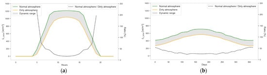 Based on this, the solar radiation density () received on a specific day of the year (Equation (14)), at a specific location on Earth (Equation (15)), and under specific atmospheric conditions (Equation (16)), is referred to as and is modeled as follows: