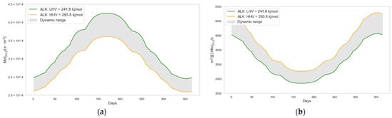 The value of the hydrogen heating value constant (HV) depends on the design of the green hydrogen station and its energy recovery capacity. Therefore, the electrolyzer model allows for the use of both the higher heating value of hydrogen (HHV = 285.8 ) and the lower heating value (LHV = 241.8 ). The actual efficiency of the electrolyzer is modeled by dividing the theoretical calculation by an efficiency coefficient that depends on the model and type of electrolyzer selected (). In both cases, i represents the type of technology used in the electrolyzer—ALK or PEM. The electrolyzer’s energy consumption is expressed in or .