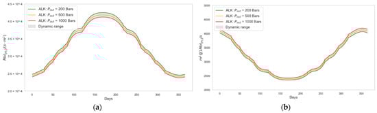 In this way, the model was obtained for the ALK electrolyzer type () (Equation (33)) and for the PEM electrolyzer type () (Equation (34)). Both results are expressed in bar.