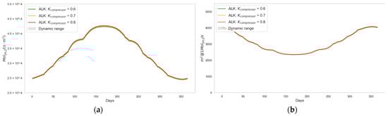 The theoretical value of is calculated based on , Y, the inlet pressure of the compressor, equal to the electrolyzer’s output pressure (), and the outlet pressure (), which corresponds to the hydrogen storage pressure (Equation (36)). This calculation can also be performed based on the hydrogen volumes at the compressor’s inlet () and outlet () (Equation (37)).