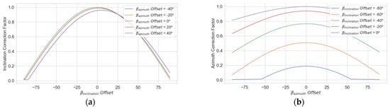 Expression (Equation (23)) presents the geometric conversion factor necessary to normalize the direct solar radiation density (Equation (16)) impacting the panel surface (). This normalization depends on (Equation (8)), (Equation (9)), the panel inclination angle relative to the ground (), and the panel azimuth angle () relative to the north or south, depending on the hemisphere in which the installation is located [30].