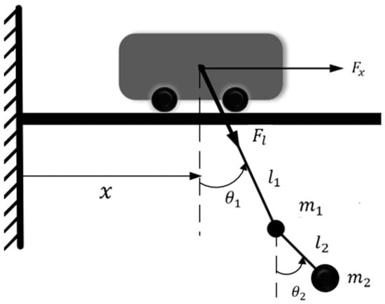 The crane model consists of a trolley, rope, hook and load. The two-dimensional schematic diagram of the fixed rope length double pendulum model is shown in Figure 1. Among them, is the mass of the trolley, is the mass of the hook, is the mass of the load, is the displacement of the trolley, is the length of the rope connecting the trolley and the hook, is the length of the rope connecting the hook and the load, and are the hook swing angle and the load swing angle, and the driving force of the trolley is .