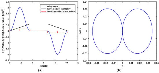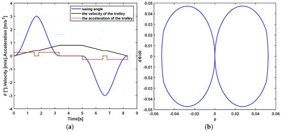 Swing angle, trolley velocity, acceleration and phase plane trajectory of the load at maximum swing angle of 2°: (a) trolley velocity, acceleration and load swing angle; (b) phase plane trajectory of the load.