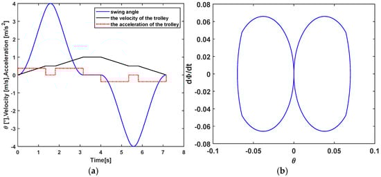 Swing angle, trolley velocity, acceleration and phase plane trajectory of the load at maximum swing angle of 4°: (a) trolley velocity, acceleration and load swing angle; (b) phase plane trajectory of the load.