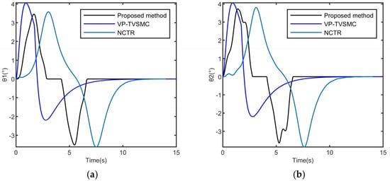 According to the comparison of hook and load swing angles of the three methods in Figure 8, the black line (proposed method) shows significant advantages within 0–15 s: its swing angle fluctuation amplitude is the smallest and the convergence speed is the fastest (basically tending to balance after about 7 s), while the blue line (VP-TVSMC) and the light blue line (NCTR) basically tend to balance after about 13 s. The blue line has a larger swing angle amplitude (up to 4°) and a longer oscillation duration. The black line effectively suppresses the load swing through a better control strategy and is superior to the other two methods in terms of dynamic response speed and steady-state accuracy.
