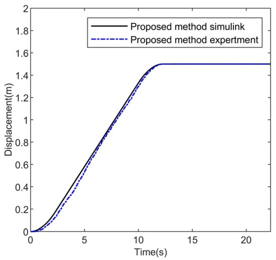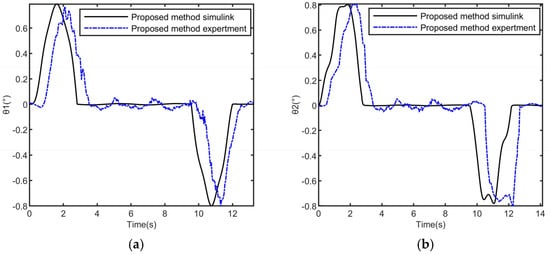 The comparison results between the experiment and the simulation are shown in Figure 10 and Figure 11. The experimental results show that the actual time for the trolley to reach the target position is consistent with the simulation, and the actual maximum hook swing angle and load swing angle are both within the constraint range. Due to the inevitable external interference and hardware conditions in the experiment, the experimental curve will have slight fluctuations but the overall trend of the experimental curve is consistent with the simulation curve. Therefore, the proposed control method still achieves good control performance in the physical experiment.