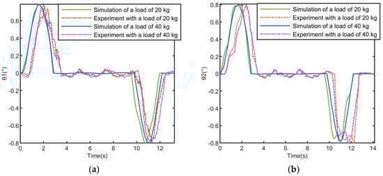 Figure 12 shows the comparison between the anti-sway control simulation and the experiment for loads of different masses. The results showed that the change in load mass has little effect on the dynamic response trend of the swing angle, and the swing angle attenuation law under different masses is consistent. Specifically, despite the significant difference in load mass (from 20 kg to 40 kg), the proposed control method can still effectively suppress the load swing, and the swing angle peak value and steady-state time do not show obvious fluctuations, showing that the control strategy has strong robustness to changes in mass parameters. This result indirectly verifies the control model’s adaptability to the load and provides a theoretical basis for anti-sway control in quality uncertain scenarios in actual engineering.