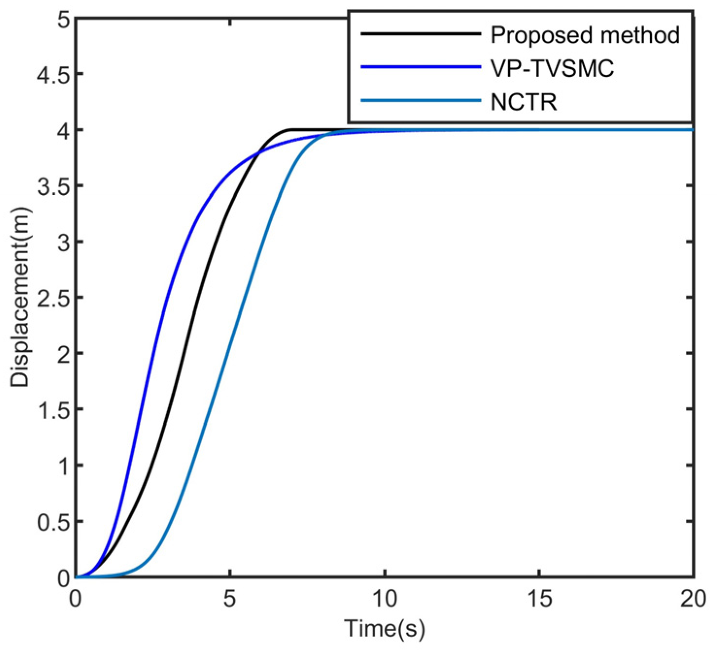 The displacement image of the trolley is shown in Figure 7. It can be seen from the figure that within the time range of 0–20 s, the displacement growth rate of the black line (Proposed method) is the fastest (about 7 s to reach 4 m), and there is no oscillation in the later period. Compared with VP-TVSMC and NCTR, it can achieve the target displacement more quickly and stably, showing higher control efficiency.