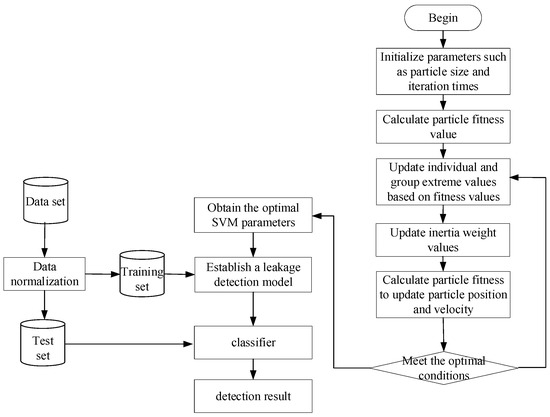 The single-phase grounding detection model based on PSO-SVM is mainly divided into two parts, the PSO algorithm and the SVM. By improving the inertia weight value in the particle swarm algorithm, the value of the learning factors is accordingly enhanced. Furthermore, by introducing a flight-time factor to optimize the particle position update formula, the optimization speed is accelerated, thereby obtaining an improved PSO algorithm. The SVM parameters C and g are fine-tuned using the improved PSO algorithm to find the most suitable parameters. After preprocessing the data set of grounding faults in low-voltage systems, it is divided into a training set and a test set in a certain proportion. The features of the data set are used as inputs, and the fault detection model is employed for prediction to obtain the output results. The specific steps of Figure 4 are as follows: