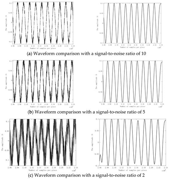 Due to the influence of the experimental environment and other aspects, the original grounding data collected by the NI equipment have great noise, so the original grounding data need to be denoised and filtered. The data waveform before and after processing is shown in Figure 5. It can be seen that the grounding waveform after wavelet transform filtering is smoother. With the decrease in the signal-to-noise ratio, the denoising effect slightly reduces.
