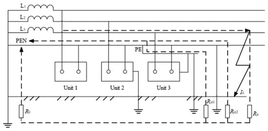 This single-phase grounding fault occurs in a three-phase five-wire distribution system (L1/L2/L3 phases, PEN protective neutral line, and PE dedicated protective earth, as shown in Figure 6). When a phase conductor (e.g., L3) accidentally contacts equipment housing due to insulation failure, fault current Id forms a loop through: