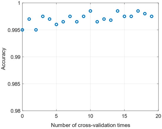 As can be observed from the above Figure, the average grounding fault detection accuracy is 99.69%, and the fault detection accuracy of the partial swarm optimization support vector machine (PSO-SVM)-based fault detection model can achieve over 99.5% in all multiple cross-validation scenarios.
