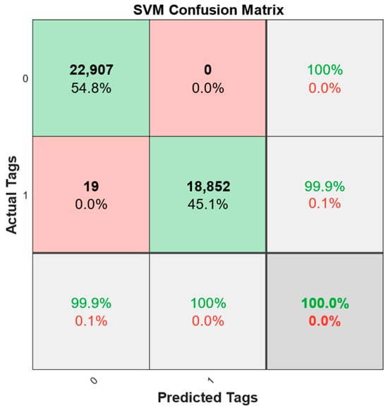 The confusion matrix algorithm model uses the two-dimensional matrix made up of test set labels and model test set output labels as input, and Figure 9 displays the confusion matrix’s schematic as output. The confusion matrix indicates that the fault detection model’s incorrect identification rate is 19 times, with the fault state being identified as the normal state 19 times and the normal state being identified as the fault state 0 times. The fault detection model’s detection accuracy, which is based on PSO-SVM, is 99.7%. In order to further improve the adaptability of the model under complex multi-operating conditions, it is necessary to further optimize the parameter configuration strategy and focus on exploring the influence mechanism of step size adjustment on system robustness. These will be the technical difficulties that need to be broken through in the subsequent algorithm iteration.