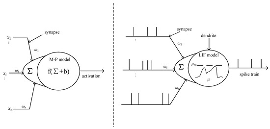 Most current neural networks are based on the McCulloch–Pitts (M-P) model. Its basic theory is to formalize neurons into an activation function composite with the form of a weighted sum, as shown in the left half of Figure 1. Although the M-P model is widely used in the field of deep learning, it is still far from the cell structure of real neurons. In comparison, SNNs use biologically closer spiking neurons as basic computing units to process information non-linearly. Different types of spiking neuron models describe the changes in cell membrane potential and the mechanism of pulse generation at different levels of detail [22].