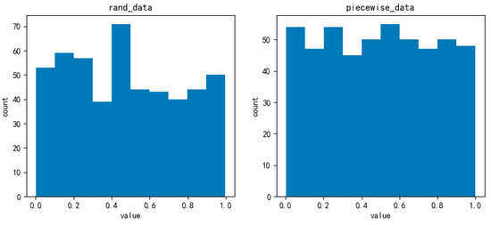 In Equation (11), is 0~0.5 and is a random value. We used 500 random values and cycled the piecewise method the same number of times. The scatter and distribution histograms are shown in Figure 3.