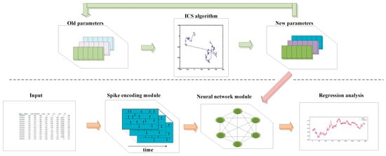 In the past, researchers always relied on experience to change parameters, which resulted in low accuracy, low efficiency, and time-consuming results. The ICS algorithm provides a way for automatically searching for solutions. So, it is natural to combine the ICS and SNNs, and we call it ICS-SNN. The flowchart of ICS-SNN is shown in Figure 6. The max iteration in the figure is not just a fixed value. During each iteration, if the quality of the current solution does not significantly improve, the search process is terminated as a convergence criterion.