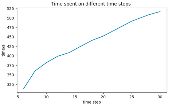 Time step. Time step means how many data are used to predict the price for the next time. If the number is set to be small, it is very likely that the model does not have enough prior knowledge to output the accurate value we expect. In contrast, if it is set to be too big, not only does it require more computing resources but it also takes more time to perform matrix operations. Time spent on different time steps is shown in Figure 5.