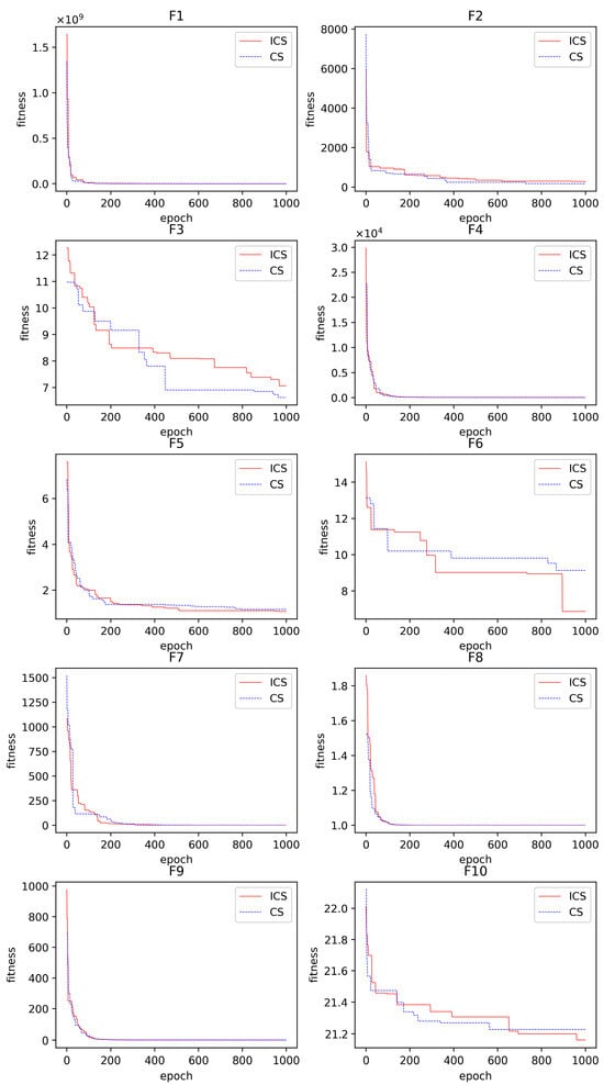 To test the universality of ICS, we conducted CEC2019 on ICS. The CEC2019 function set is a highly effective benchmark function for testing the performance of metaheuristic algorithms. In CEC2019, the F1–F3 function has different dimensional values and ranges, while the F4–F10 function is a 10-dimension minimization problem. Due to the fact that many of the CEC2019 test functions are multi-modal, they are very challenging. CEC2019 problems are shown in Table 5.