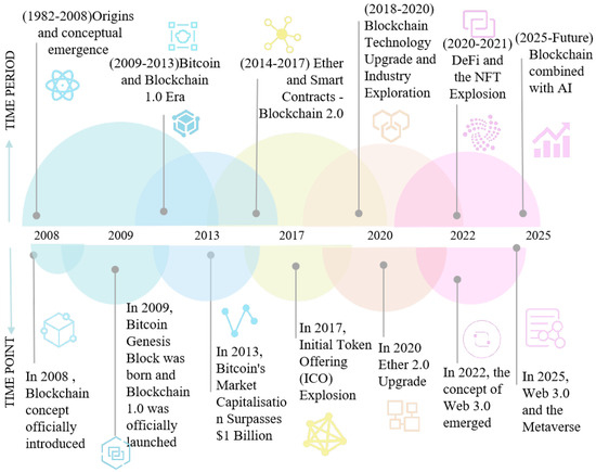 Since its inception in 2008, the concept of blockchain has evolved from merely serving as the foundational technology for cryptocurrencies to enabling innovative applications across various industries [1]. In 2016, Bitcoin’s market capitalization surpassed USD 10 billion for the first time, marking a critical milestone that elevated public attention towards blockchain technology beyond its association with cryptocurrencies [2]. This financial threshold catalyzed a shift in perception, positioning blockchain as a decentralized peer-to-peer infrastructure capable of maintaining transparent, tamper-resistant ledgers across various domains. Consequently, the concept of “Blockchain+” emerged, promoting blockchain’s integration into industries such as finance, supply chain management, healthcare, and public services [3,4,5]. This evolution highlights blockchain’s transition from a niche technology to a cornerstone of global digital innovation and competition.
