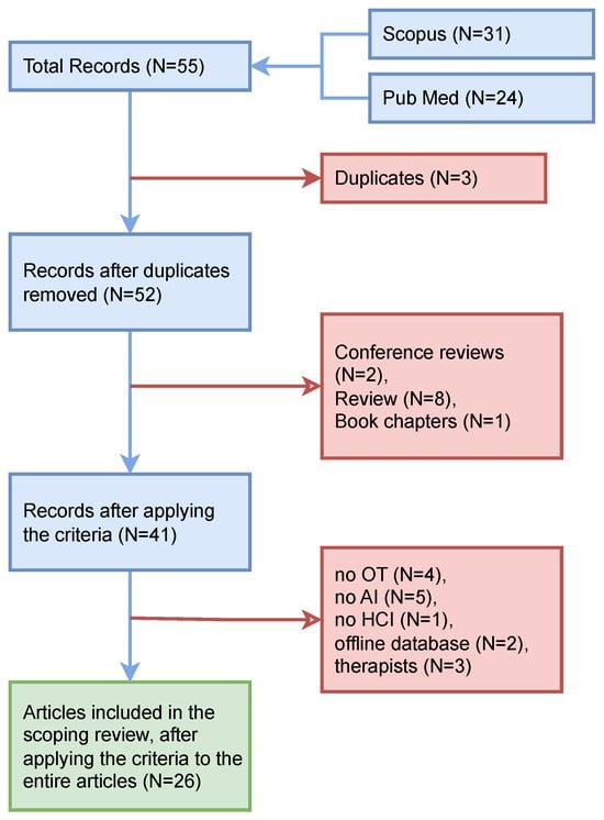 The literature search was performed using the PubMed and Scopus databases, selected for their comprehensive coverage of healthcare and OT research, as well as their alignment with the PRISMA-ScR guidelines []. To refine the search, relevant keywords related to “artificial intelligence”, “human–computer interaction”, and “occupational therapy” were combined using the Boolean operator AND. Articles were included in the review if these keywords appeared in the title, abstract, or as designated keywords. The complete search strings for each database are provided (https://doi.org/10.17605/OSF.IO/9WFQD).