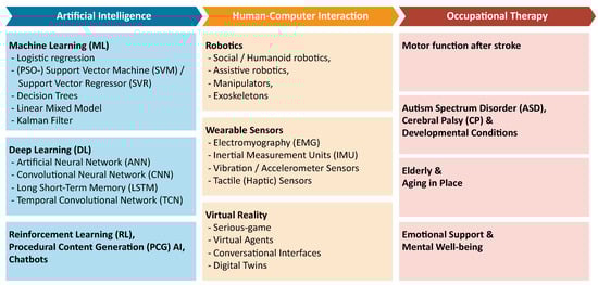 In recent years, AI has gained significant traction across various medical fields, demonstrating its potential to enhance diagnostics [], prognostics [], treatment planning [], surgery [], and patient monitoring []. Numerous reviews have mapped these broad medical applications, highlighting how ML, DL, and natural language processing transform healthcare delivery. Such applications of AI in healthcare range from medical imaging [,] and precision medicine [,] to predictive analytics [], big data [], and robotic surgery [], thus offering enhanced accuracy and efficiency in clinical decision-making []. However, while the integration of AI into traditional medical disciplines has been extensively studied, its role in supporting patient-centered interventions such as OT, particularly through HCI technologies, remains underexplored. This scoping review aims to bridge this gap by uniquely focusing on the intersection of AI, HCI, and OT, identifying and mapping the current research, highlighting applications, and proposing directions for future work.